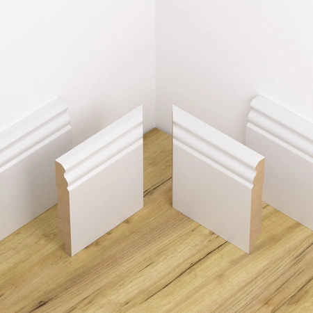 MDF (Medium Density Fiberboard) to płyta drewnopochodna o średniej gęstości, szeroko stosowana w produkcji listew przypodłogowych i dekoracyjnych. Łączy stabilność wymiarową z gładką powierzchnią, która ułatwia malowanie i wykończenie według indywidualnych potrzeb.