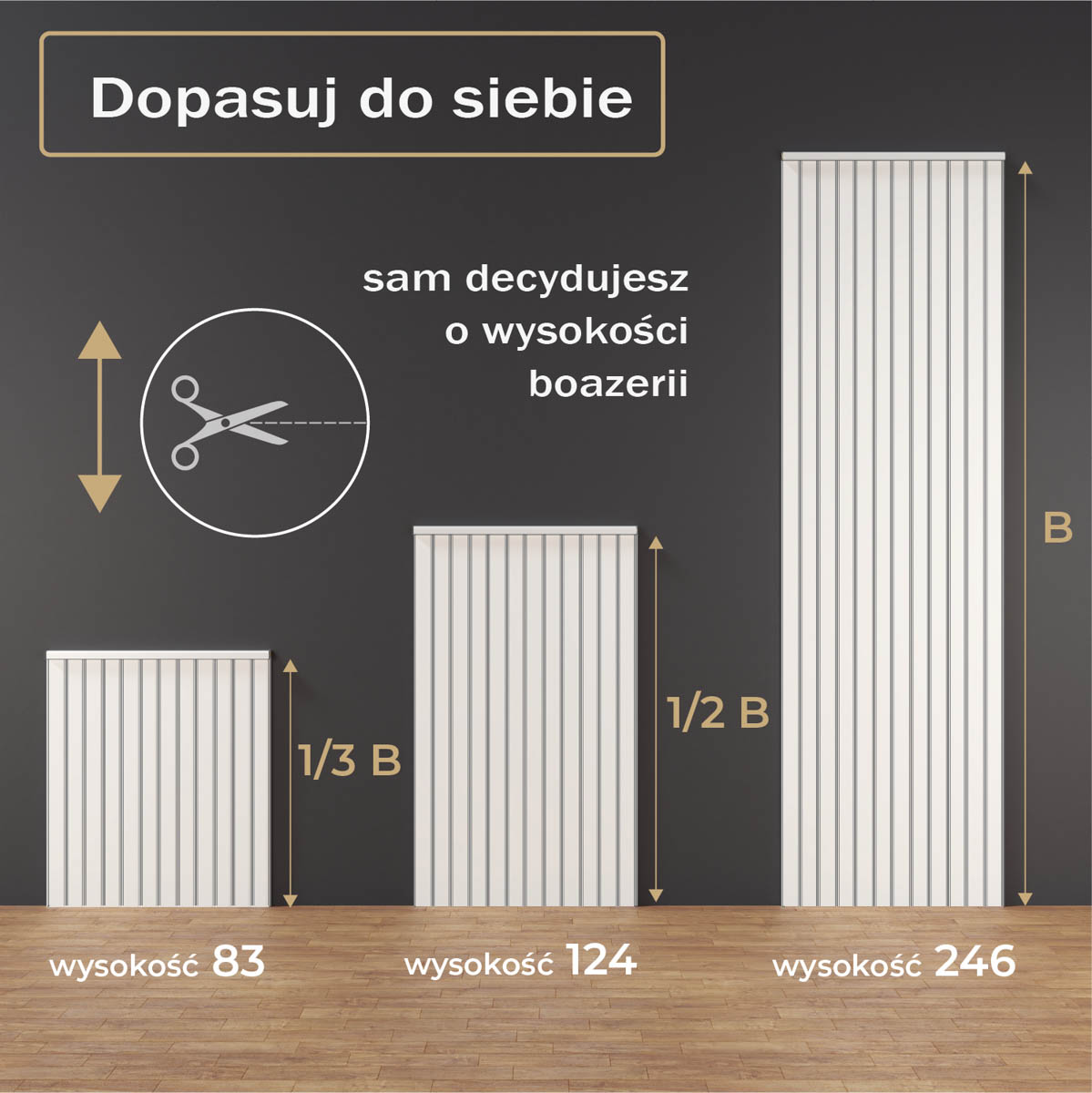 Listwy środkowe należy przyciąć we własnym zakresie na 3 równe części o długości 81 cm. Po złożeniu boazeria osiąga wysokość 83 cm i długość 225 cm.