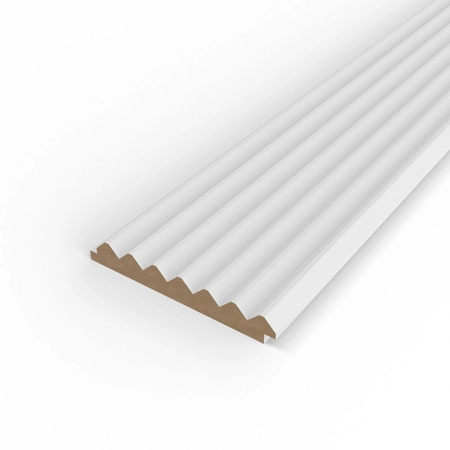 MDF (Medium Density Fiberboard) to płyta drewnopochodna o średniej gęstości, szeroko stosowana w produkcji listew przypodłogowych i dekoracyjnych. Łączy stabilność wymiarową z gładką powierzchnią, która ułatwia malowanie i wykończenie według indywidualnych potrzeb.