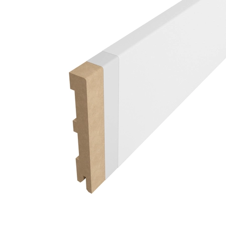 MDF (Medium Density Fiberboard) to płyta drewnopochodna o średniej gęstości, szeroko stosowana w produkcji listew przypodłogowych i dekoracyjnych. Łączy stabilność wymiarową z gładką powierzchnią, która ułatwia malowanie i wykończenie według indywidualnych potrzeb.
