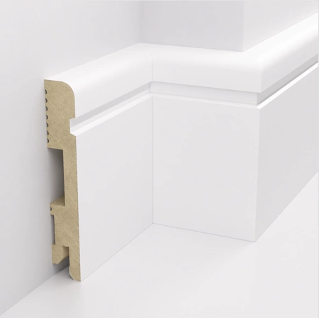 MDF (Medium Density Fiberboard) to płyta drewnopochodna o średniej gęstości, szeroko stosowana w produkcji listew przypodłogowych i dekoracyjnych. Łączy stabilność wymiarową z gładką powierzchnią, która ułatwia malowanie i wykończenie według indywidualnych potrzeb.