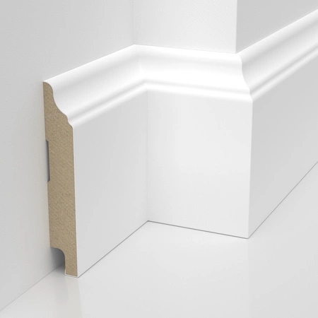 MDF (Medium Density Fiberboard) to płyta drewnopochodna o średniej gęstości, szeroko stosowana w produkcji listew przypodłogowych i dekoracyjnych. Łączy stabilność wymiarową z gładką powierzchnią, która ułatwia malowanie i wykończenie według indywidualnych potrzeb.