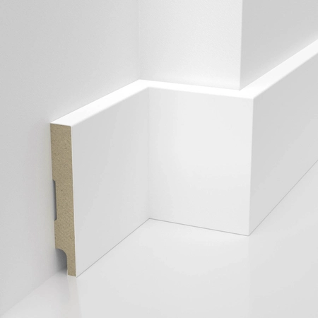 MDF (Medium Density Fiberboard) to płyta drewnopochodna o średniej gęstości, szeroko stosowana w produkcji listew przypodłogowych i dekoracyjnych. Łączy stabilność wymiarową z gładką powierzchnią, która ułatwia malowanie i wykończenie według indywidualnych potrzeb.