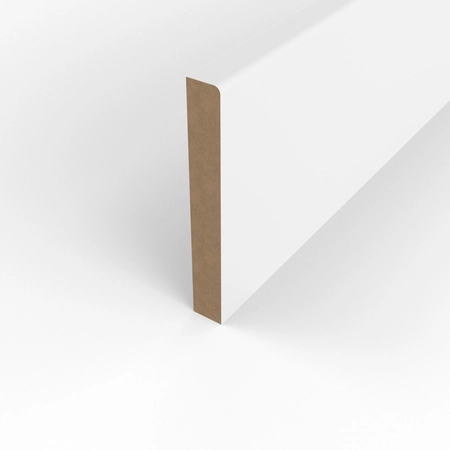 MDF (Medium Density Fiberboard) to płyta drewnopochodna o średniej gęstości, szeroko stosowana w produkcji listew przypodłogowych i dekoracyjnych. Łączy stabilność wymiarową z gładką powierzchnią, która ułatwia malowanie i wykończenie według indywidualnych potrzeb.