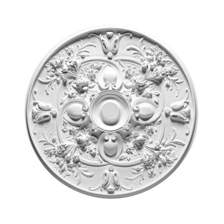 - Duża, klasyczna rozeta sufitowa R24, ozdobiona pięknym ornamentem, jest doskonałym elementem sztukaterii wewnętrznej, dodającym elegancji każdemu wnętrzu.
