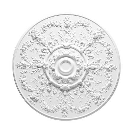 - Rozeta sufitowa R64 to największy model z klasycznym ornamentem, idealny do dużych powierzchni, z wnęką do ukrycia okablowania.
