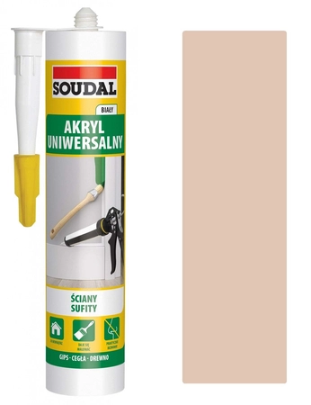 - Akryl uniwersalny Soudal w kolorze beżowym to trwały uszczelniacz o doskonałej przyczepności do porowatych podłoży, który po utwardzeniu daje się malować i nie przebarwia powłok malarskich.