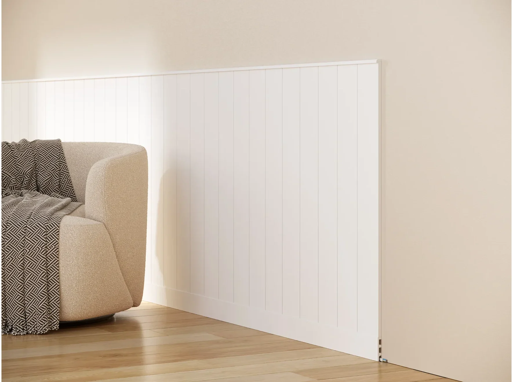 - Zwieńczenie boazerii angielskiej, idealne do eleganckiej zabudowy ścian w salonie, holu czy na klatce schodowej. Wodoodporne, odporne na zarysowania i gotowe do malowania – doskonałe do każdego typu wnętrza.